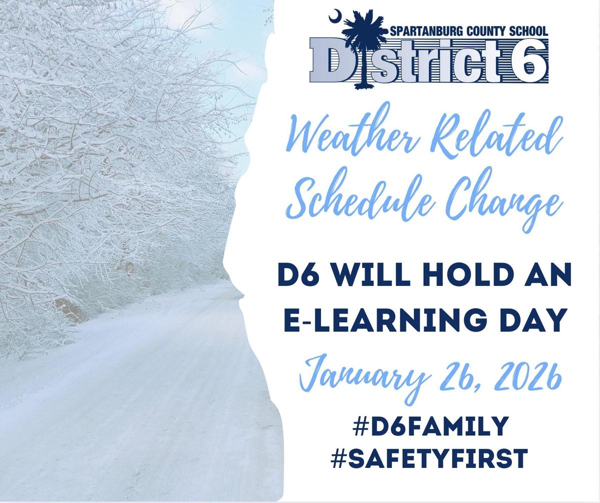 Just like most families in our community, District Six has been closely monitoring the weather forecast. The National Weather Service has just issued an "Ice Storm Warning" beginning Saturday and continuing through Monday. Based on the strong potential for inclement weather and unsafe travel conditions, D6 will hold an E-Learning Day on Monday, January 26, 2026. Teachers will help prepare students today for assignments and flexible options for those who experience power outages.